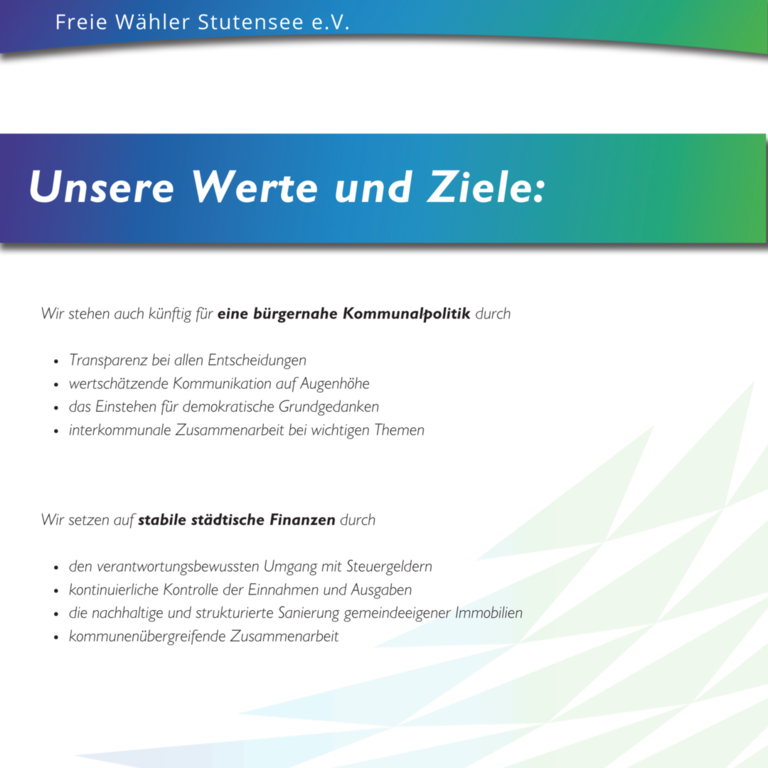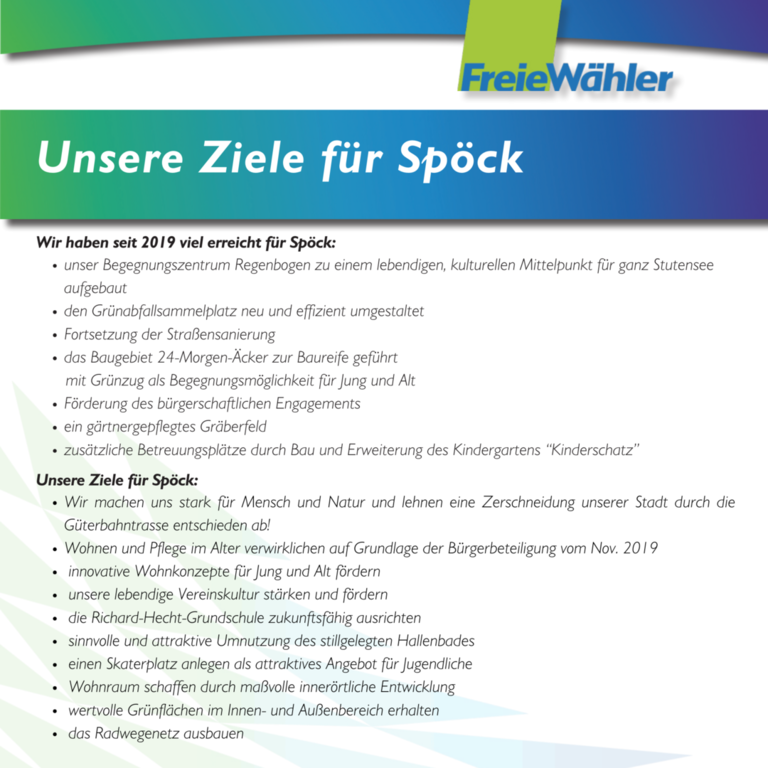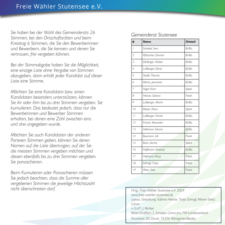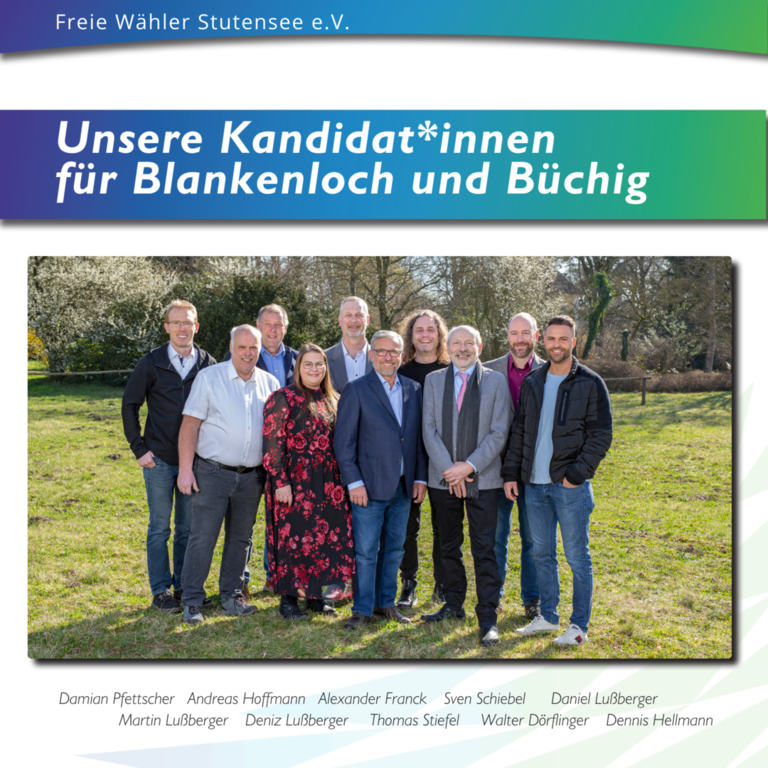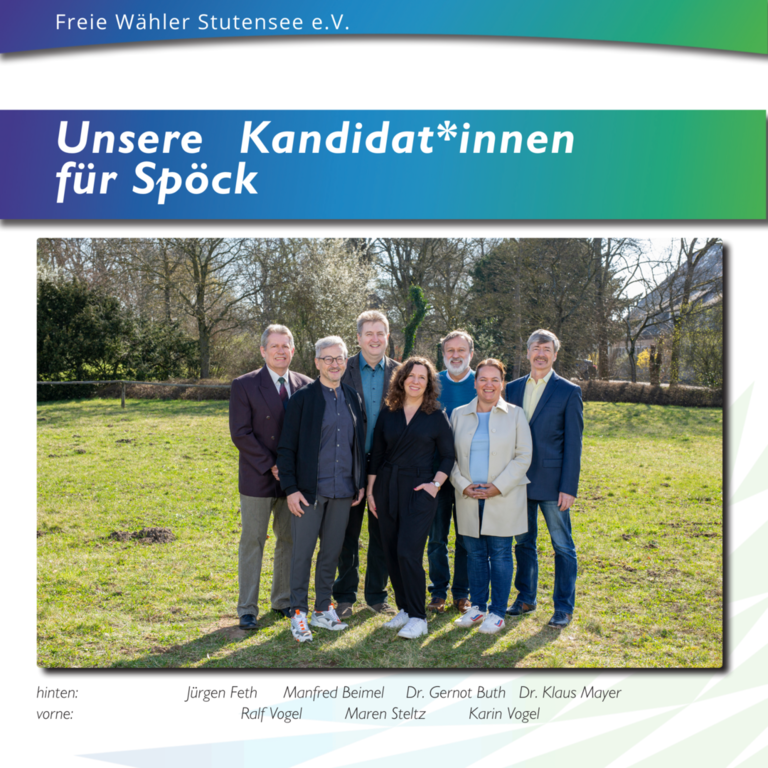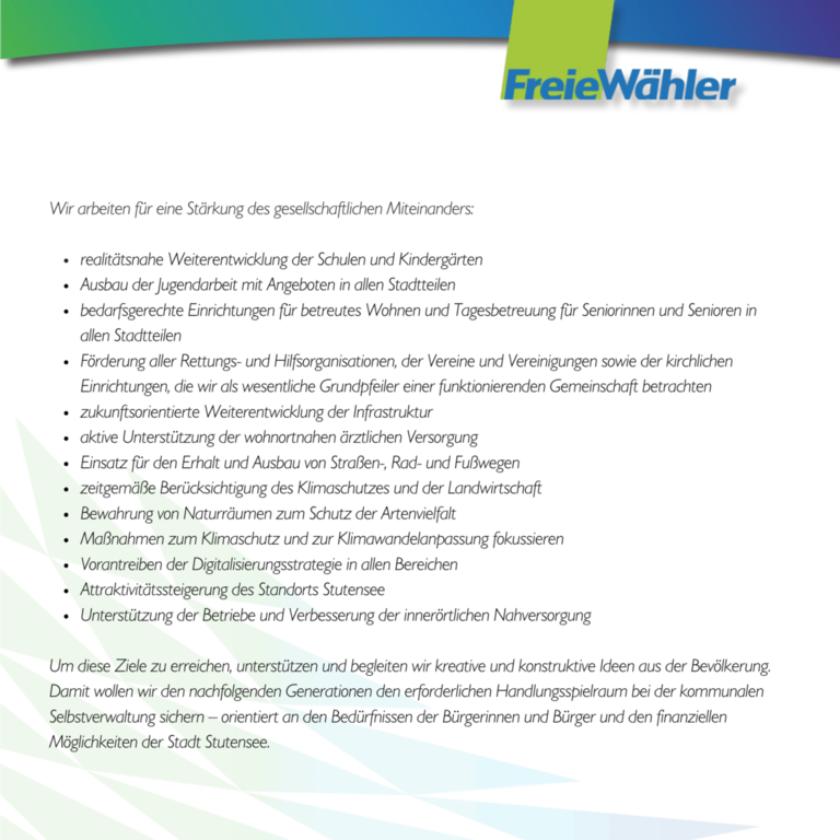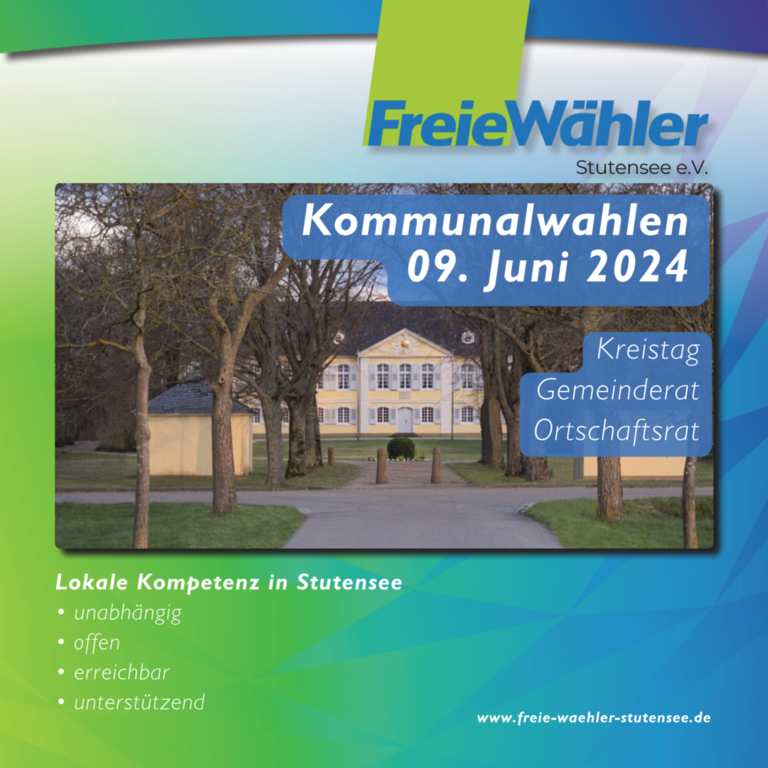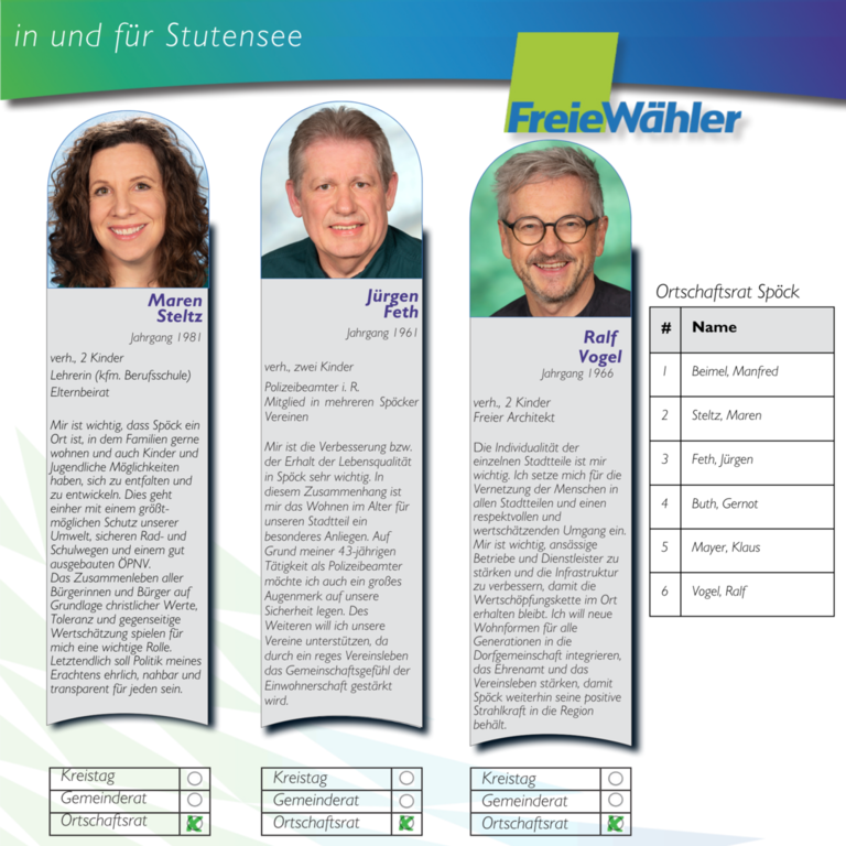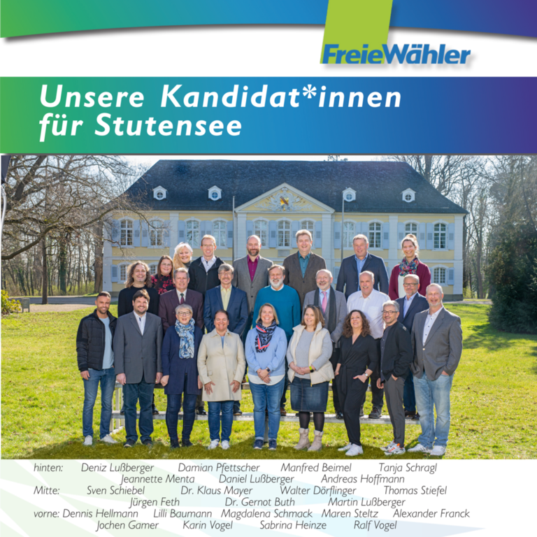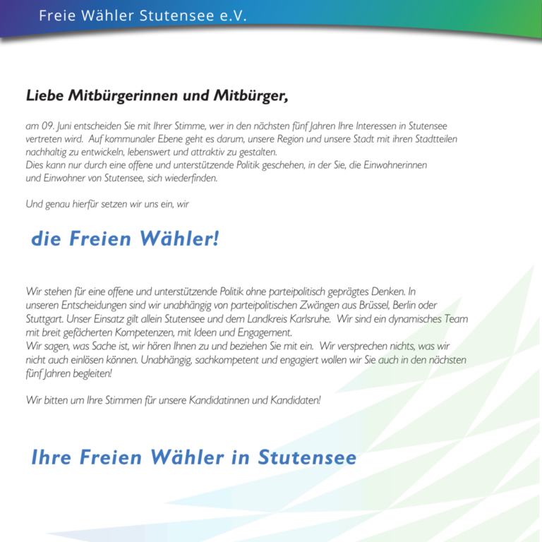Am 09. Juni entscheiden Sie mit Ihrer Stimme, wie sich der Gemeinderat der Stadt Stutensee künftig zusammensetzen wird und wer Ihre Interessen in Stutensee vertritt. Für uns Freie Wähler geht es darum, unsere Stadt mit ihren Stadtteilen weiter zu entwickeln und lebenswert und attraktiv zu gestalten. Wir Freien Wähler stehen für eine sachorientierte und bürgernahe Politik mit einem ganz klaren Fokus auf unsere Stadt. Über Jahrzehnte hinweg waren die Freien Wähler eine wichtige kommunalpolitische Kraft in Stutensee und das stetig gestiegene Vertrauen, das Sie uns bei zurückliegenden Wahlen entgegengebracht haben, zeigt deutlich, dass wir auf dem richtigen Weg sind. Geradlinigkeit, Aufrichtigkeit und Dialogbereitschaft sind Werte für die wir stehen. Unabhängig, sachkompetent und engagiert wollen wir Sie auch in den kommenden fünf Jahren begleiten; mit einem Team von jungen, dynamischen Kandidaten, von kommunalpolitisch erfahrenen Kräften und in erster Linie von Menschen, die sich für ihre Stadt und deren Einwohner einbringen wollen. Also sprechen Sie uns an, persönlich oder beim Besuch einer Veranstaltung oder an einem unserer Infostände in den Wochen vor der Wahl.