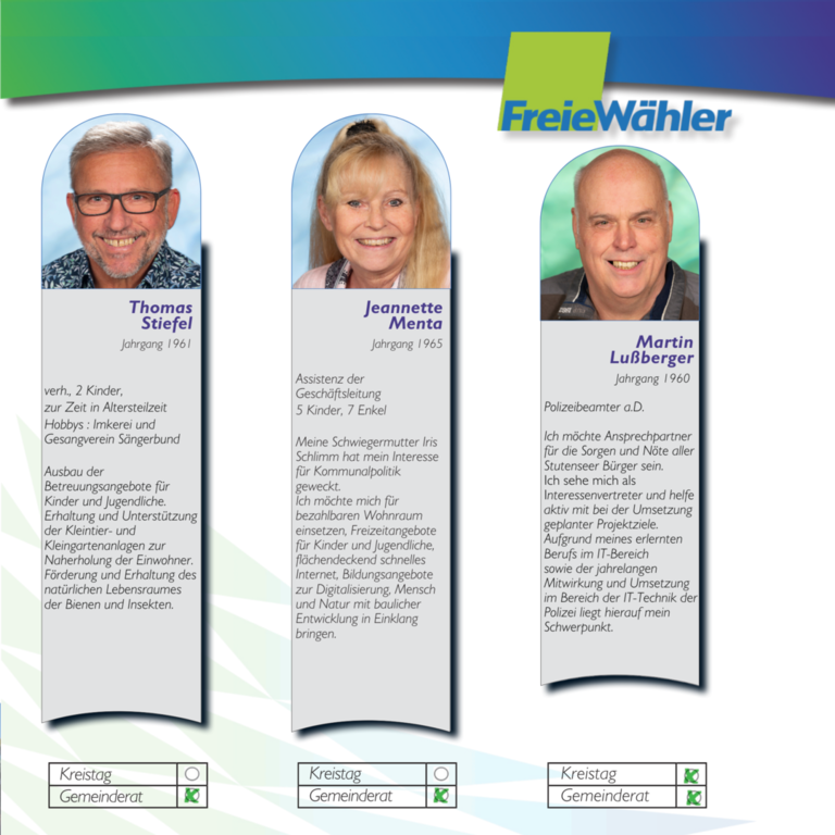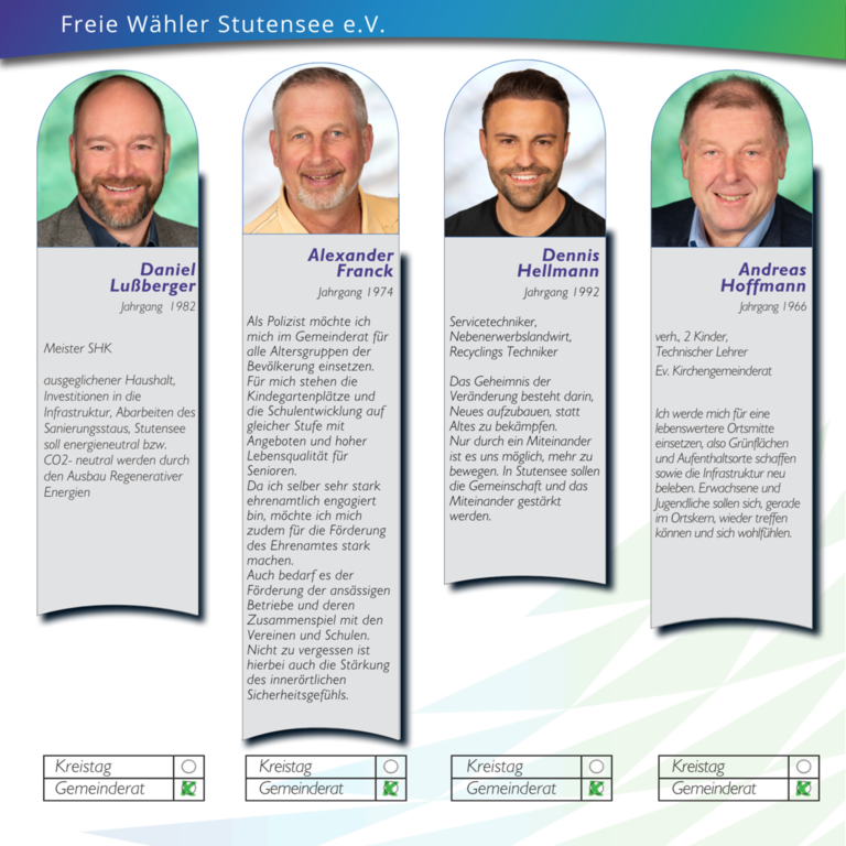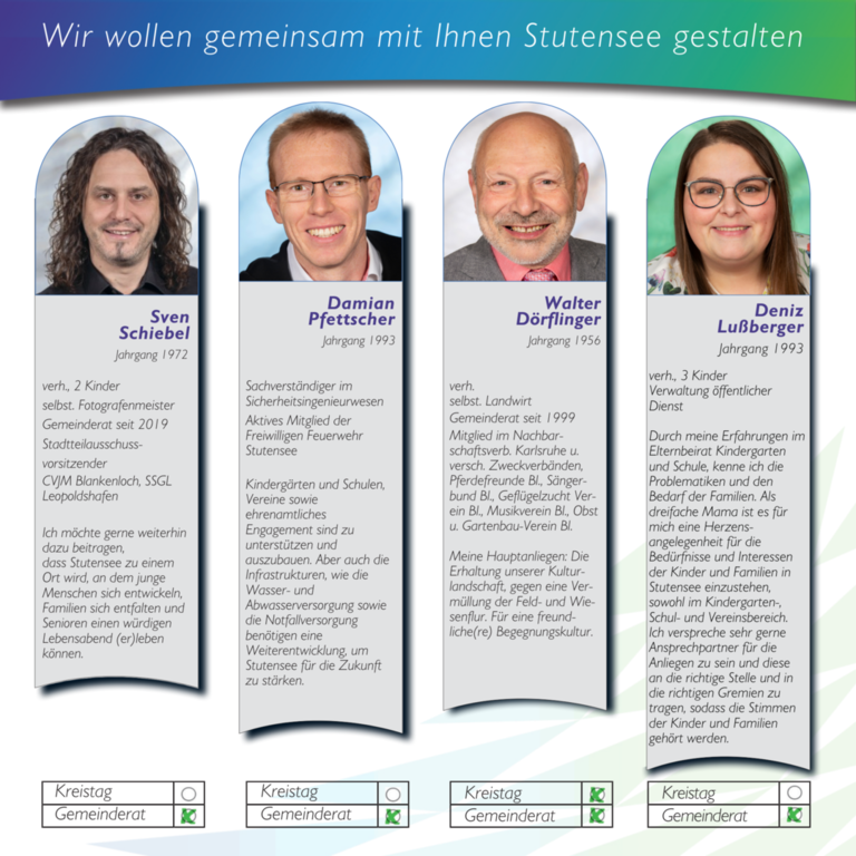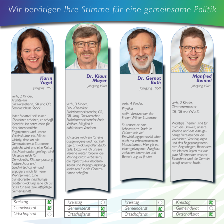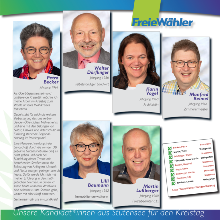 Wir Freien Wähler Stutensee und die Weingartener Bürgerbewegung sind zuversichtlich, mit unserem erfahrenen Team die Interessen der Bürgerinnen und Bürger im Landkreis Karlsruhe erfolgreich vertreten zu können.