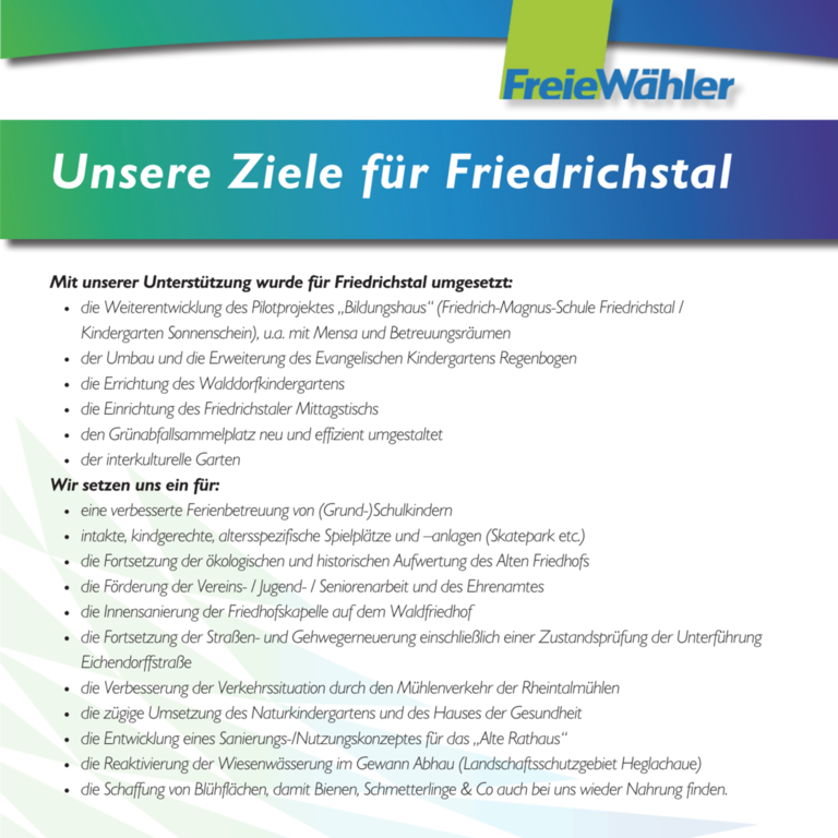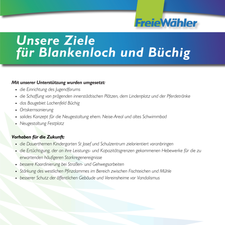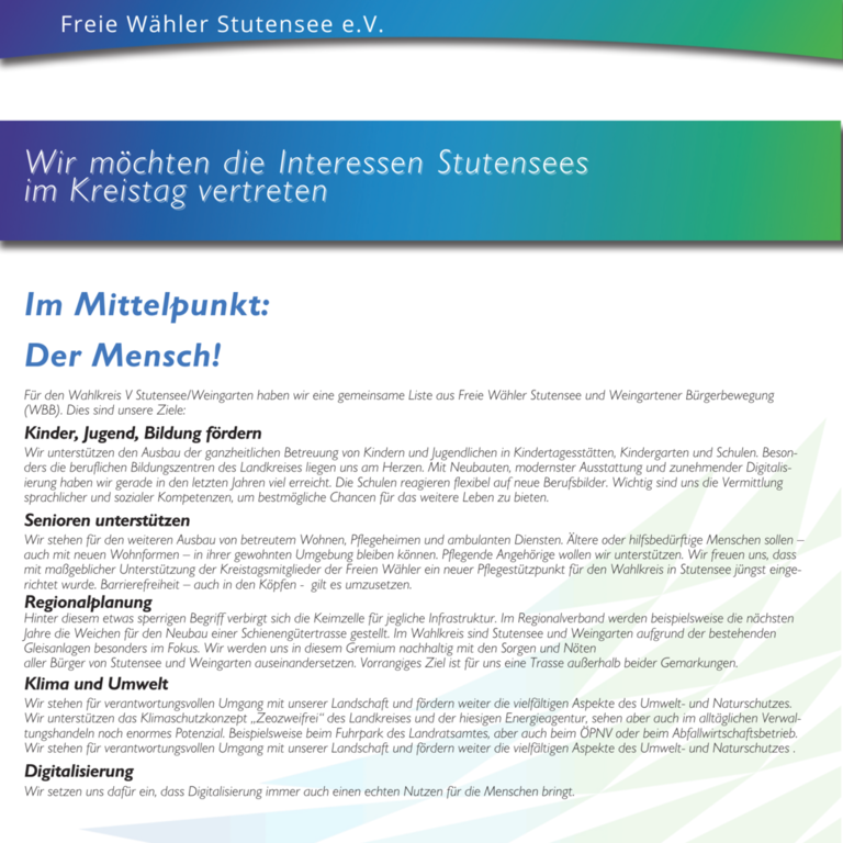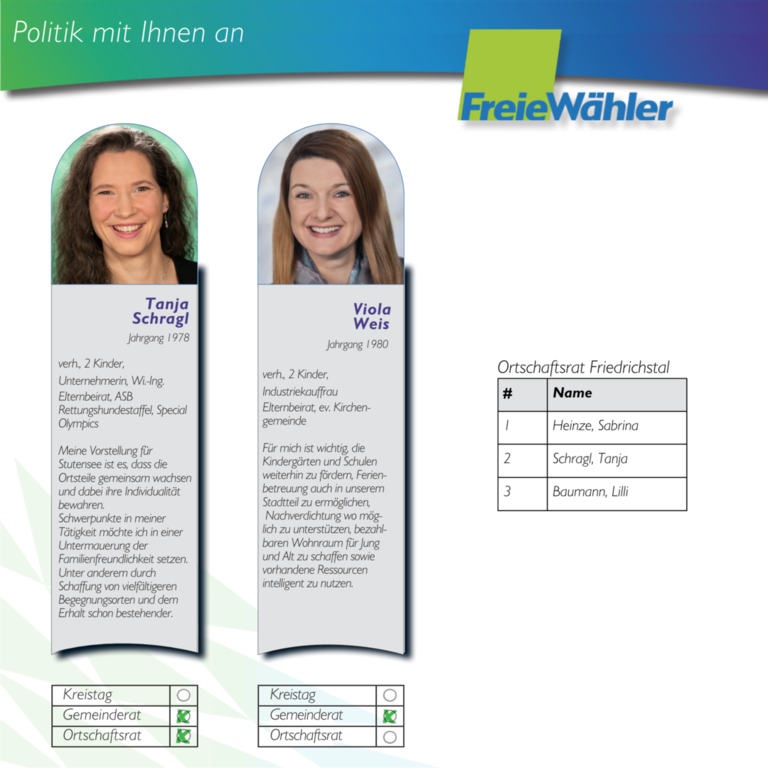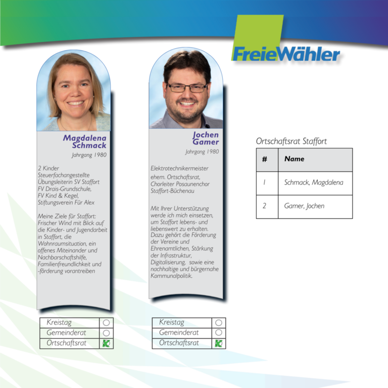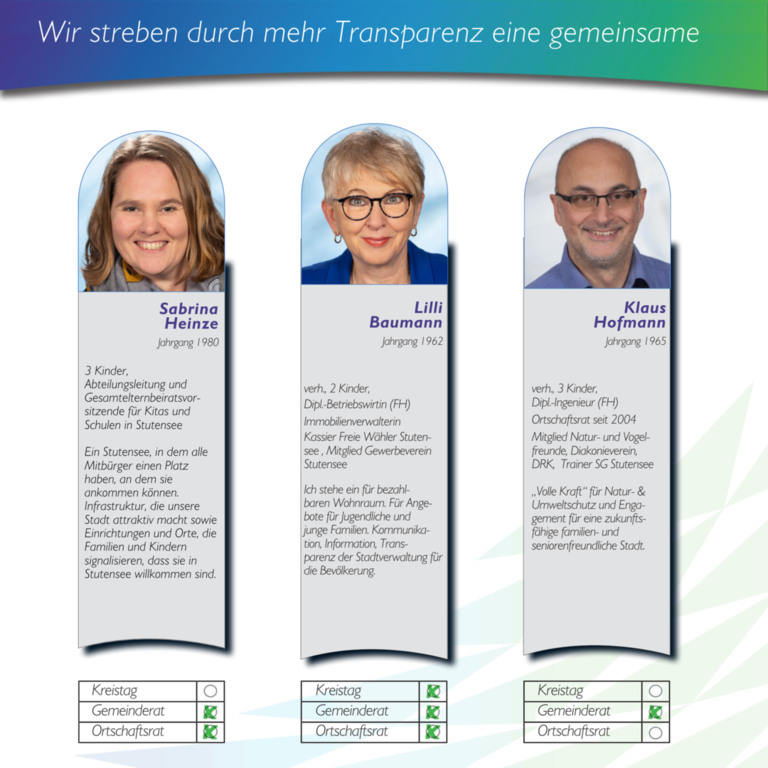 Wir Freien Wähler Stutensee und die Weingartener Bürgerbewegung sind zuversichtlich, mit unserem erfahrenen Team die Interessen der Bürgerinnen und Bürger im Landkreis Karlsruhe erfolgreich vertreten zu können.
