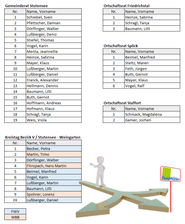 An der Spitze der Liste steht unsere Oberbürgermeisterin Petra Becker mit all ihrer Erfahrung, gefolgt vom WBB-Fraktionsvorsitzenden im Weingartener Gemeinderat, Timo Martin, auf Platz 2 Stadt- und Kreisrat Walter Dörflinger aus Stutensee belegt den dritten Listenplatz. Die Plätze 4 bis 9 werden von weiteren engagierten Persönlichkeiten aus Stutensee und Weingarten mit reichlich kommunalpolitischer Erfahrung besetzt, darunter Hans-Martin Flinspach, Manfred Beimel, Karin Vogel, Martin Lußberger, Lilli Baumann und Lorenz Spohrer. Als Ersatzkandidat steht Daniel Lußberger zur Verfügung.